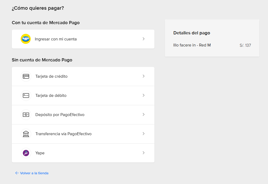 Mira la imagen abajo: me da la opción de ingresar con mi cuenta MP, usar tarjetas e incluso métodos locales en Perú como Yape.