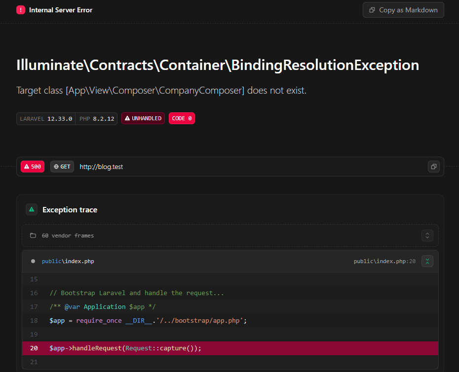 <?php namespace App\View\Composers; use App\Repositories\UserRepository; use Illuminate\View\View; class CompanyComposer { public function compose(View $view): void { $view->with('prueba', 'Hola mundo'); } }Luego, para compartirlo con una vista, debes dirigirte a cualquier provider, por ejemplo App\Providers\AppServiceProvider y ejecutar el siguiente codigo